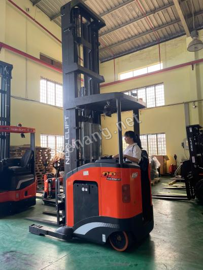 Xe nâng Reach Truck đứng lái 1,5 tấn dạng cắt kéo Model RT15DP của NOBLELIFT là dòng xe nâng điện chuyên dụng, thiết kế hiện đại, giúp tối ưu hóa hoạt động trong kho hàng, đặc biệt là những không gian hẹp. Dưới đây là những đặc điểm nổi bật của dòng xe này: